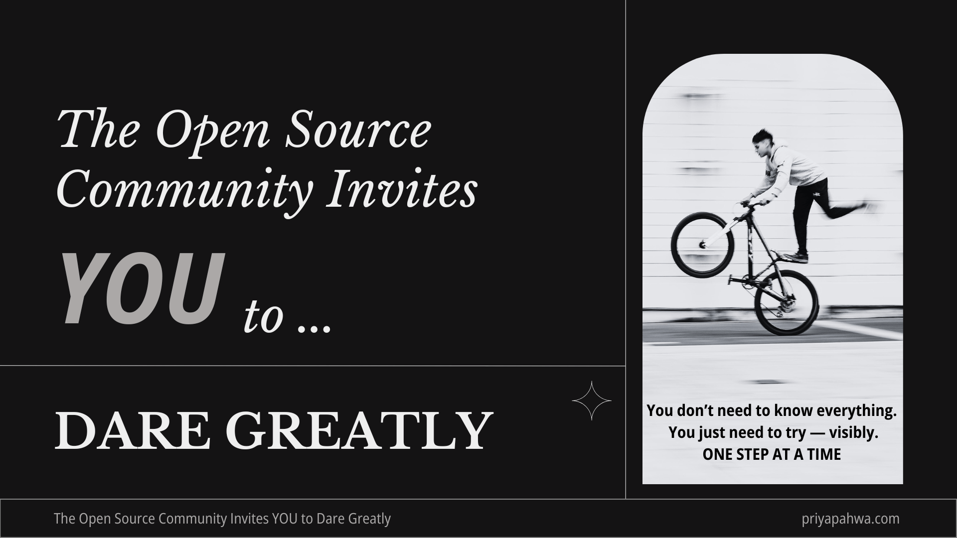 Daring greatly is not about being bold. It is about being willing to be seen while still learning. It is less about where you start and more about how you grow with others. Each question asked, PR opened, or idea shared moves the ecosystem — and YOU — forward and contribution begins just there.